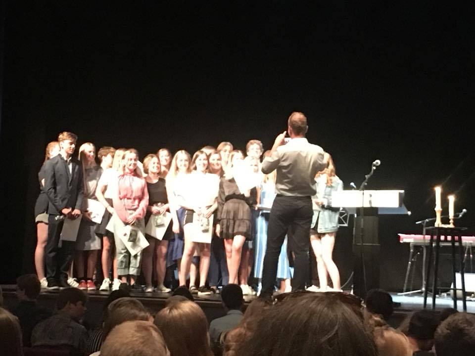 Her ses lysestagen stå og brænde på scenen ved overrækkelsen af elevernes beviser.